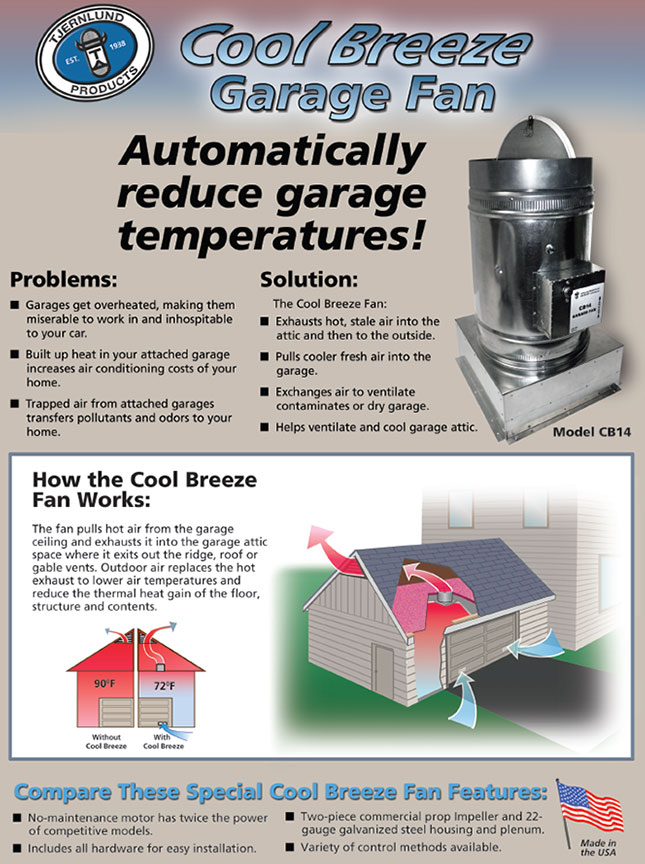 The fan pulls hot air from the garage ceiling and exhausts it into the garage attic space where it exits out the ridge, roof or gable vents. Outdoor air replaces the hot exhaust to lower air temperatures and reduce the thermal heat gain of the floor, structure and contents. |